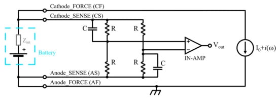 - Gong, Z.; Liu, Z.; Wang, Y.; Gupta, K.; Da Silva, C.; Liu, T.; Zheng, Z.H.; Zhang, W.P.; van Lammeren, J.M.; Bergveld, H.J.; et al. IC for online EIS in automotive batteries and hybrid architecture for high-current perturbation in low-impedance cells. In Proceedings of the 2018 IEEE Applied Power Electronics Conference and Exposition (APEC), San Antonio, TX, USA, 4–8 March 2018; pp. 1922–1929. [Google Scholar] [CrossRef]