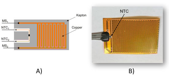 The EBS, as shown in Figure 6, consists of a commercial Negative Temperature Coefficient (NTC) resistor (Panasonic ERT-JZEV104F) and a custom comb finger capacitor used to sense the presence of moisture. This capacitor is fabricated with a standard flexible PCB process where the copper fingers are covered by a Kapton layer in order to prevent unwanted short circuits. The Kapton flexible board (30 × 20 mm2) is glued to the external body of the cell.