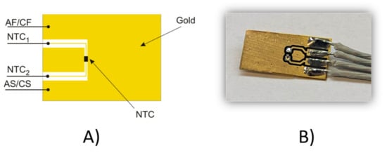 Two EESs are used in our CMU applications: one is soldered to the cathode and the other to the anode. The schematic view and the photo of one EES is shown in Figure 7. It is a 10 × 5 mm2 flexible board plated with gold and equipped with four leads. The two central leads (NTC1 and NTC2) are used to connect the NTC sensor soldered on the board. In this way, the temperature of the individual electrodes can be acquired. The other two leads (AF-AS for the anode and CF-CS for the cathode) connect the electrodes of the cell to the CMU as shown in Figure 5. In particular, AF-CF provide the supply voltage to the CMU electronic circuits and are used to apply the stimulus current signal generated by the internal current generator. The AS-CS leads connect the Wheatstone bridge to the cell (voltage sensing terminals).