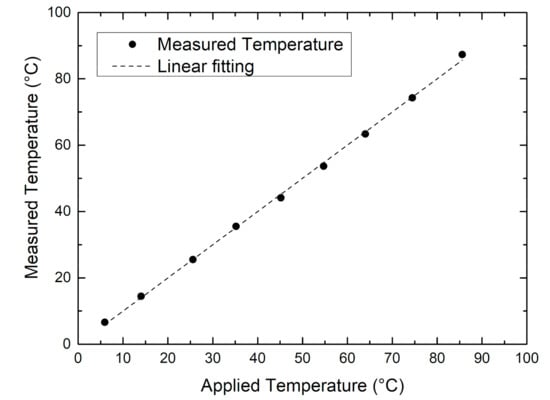 The chip temperature measurements were performed by placing the CMU on a metal plate whose temperature was controlled by means of a Peltier cryostat. The temperature was swept with 10 °C steps from 5 to 85 °C. In this way, we have tested the capability of the CMU to measure the temperature of the battery body at the location where the CMU is placed. The VTEMP signal (see Figure 4) has been converted in temperature values by the software using a simple linear relationship, based on nominal parameters estimated by electrical simulations of the SENSIPLUS chip. In Figure 9 we compare the temperature measured by the CMU (Tmeas) with the one applied by the cryostat (Tset). The linear fitting gives the following relationship: