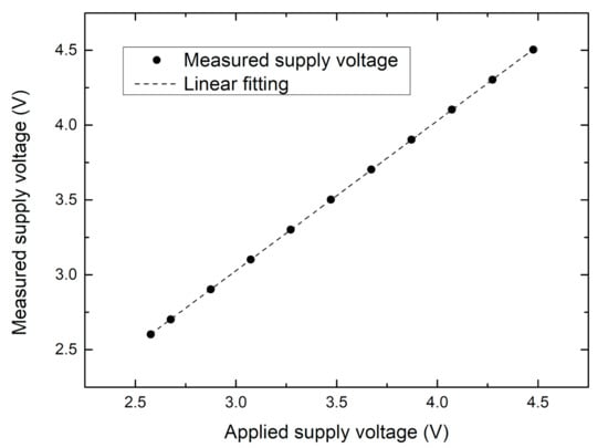 The cell voltage measurement was performed by exploiting the internal Vdd divider of the SENSIPLUS chip (see Figure 4). Note that in the used configuration, the SENSIPLUS supply voltage coincides with the cell voltage (see Figure 1). Different cell voltages were simulated by using a computer-controlled power supply (Agilent E3646A, Santa Clara, CA, USA): the supply voltage was swept from 2.6 to 4.5 V and the measurements performed by the CMU were recorded. The lower limit of the sweep was determined by the minimum voltage at which the digital isolator was found to operate correctly. The upper limit was imposed by the maximum ratings of the CMOS process used to fabricate the SENSIPLUS chip. The measurements performed by CMU () are plotted in Figure 10 as a function of the applied supply voltage () measured by a digital multimeter (Agilent 344110A).