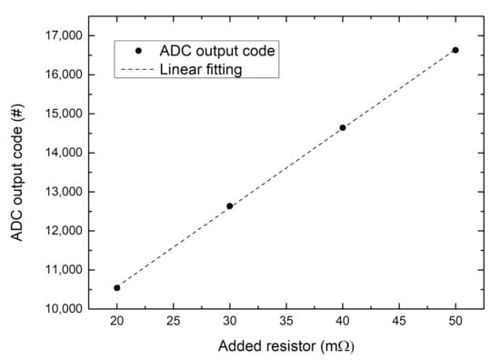 For the internal battery impedance, two different sets of measurements were performed. The first one was made to confirm the correct operation of the setup and to calibrate the impedance measurement. The second one was performed to obtain the Nyquist plot of the cell under test. In the calibration phase, four different resistors were incrementally inserted in series to the battery. In this way the battery impedance was artificially increased by a resistance varying from 20 to 50 mΩ in steps of 10 mΩ. The additional resistors were soldered to avoid any contribution from contact resistances. The measurement was performed by stimulating the battery with a sinusoidal current having a 30 mA peak-to-peak magnitude and 15 mA DC value. The raw output code produced by the ADC for a stimulus frequency of 200 Hz is shown in Figure 11 for the mentioned four resistance values. Correct operation is proved by the excellent linear behavior.