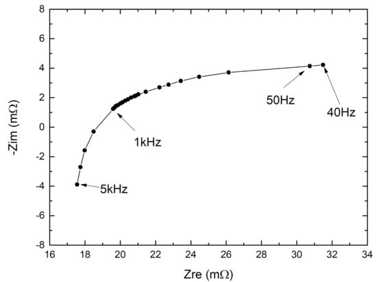 From the measurements shown in Figure 11, the parameters of the linear relationship used to convert the ADC data into resistance and reactance values have been calculated. The resolution of the resistance measurement, estimated at 1 kHz from the equivalent resistance noise, was nearly 120 μΩ. In the literature, there are very few examples of similar miniaturized vector impedance analyzer based on a single chip architecture [22,23]. In particular, a resolution of 74 mΩ @1 kHz is provided in [23], while in [22], no resolution and accuracy data are available. After calibration, the real EIS measurements were performed on the cell under test. The stimulus frequency was swept from 40 Hz to 5 kHz. The results are shown in Figure 12 where a consistent battery Nyquist plot is visible. The minimum frequency of the sweep was due to limitations of the present version of the SENSIPLUS Stimuli Synthesizer.