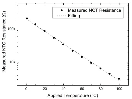A commercial NTC sensor (Panasonic ERT-JZEV104F, OSAKA, Japan), mounted into the EES board (Figure 7), has been connected to an external analog port of the SENSIPLUS chip. The EES has been fixed to the metal plate of the cryostat by means of thermal paste. Figure 13 shows the value of the measured resistance (R) as a function of temperature (T). Considering the log-Y scale, a good linearity is clearly visible, and the curve behavior confirms with the NTC datasheet characteristics.