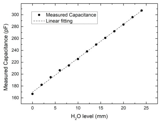 To obtain a capacitance vs. H2O level trend, the beaker was initially filled with water up to the bottom side of the EBS. The board was then gradually immersed in the water and the capacitance was measured for a set of displacements. The obtained characteristic is shown in Figure 15.