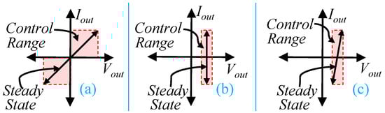 The AC current injection using power converters for AC system (grid tied inverter) is an well established technology where the power flows unidirectionally and has a significant voltage variation corresponding to current [,]. The unidirectional power flow of a single phase inverter is depicted in Figure 1a. and are the output voltage and current. The arrow line depicts the steady state operating condition. The tilted arrow indicates the AC signal. Power converters can operate beyond the steady state for transient conditions which is depicted as control range by shaded area. Compared to AC systems, AC current injection to a DC system (rechargeable battery) using a power converter is a recent idea [,]. Power can flow bidirectionally in a rechargeable battery. The power flow of a conventional bidirectional converter is shown in Figure 1b, which can control DC current for a constant voltage. A controller for conventional bidirectional converter is not enough to inject AC current into a battery. This is because a battery has a small internal impedance and a variable DC voltage offset. A significant amount of AC current causes a small voltage ripple in a battery. The AC injector for rechargeable batteries should be able to control large current within a small voltage window as shown in Figure 1c. Therefore, AC current control for rechargeable batteries is more challenging than conventional bidirectional converters.