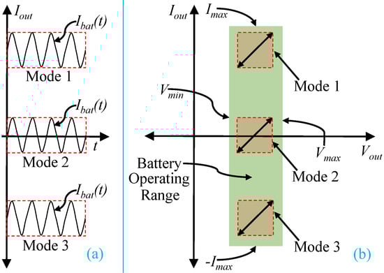 where, t is the time, is the battery current, is the DC offset current, is the magnitude of AC signal, and is the angular frequency for AC signal. is positive for mode 1 where AC current is injected to the battery while charging. is negative for discharging condition. is zero for offline AC injection. The waveforms of each mode of AC current injection are shown in Figure 2a. The existing methods available in the literature for AC current injection using power converters can operate in only one mode at a time. All three modes can be operated using proposed controller which is unique in this manuscript.