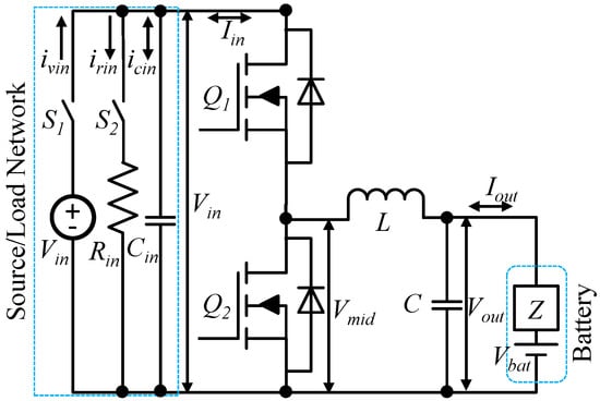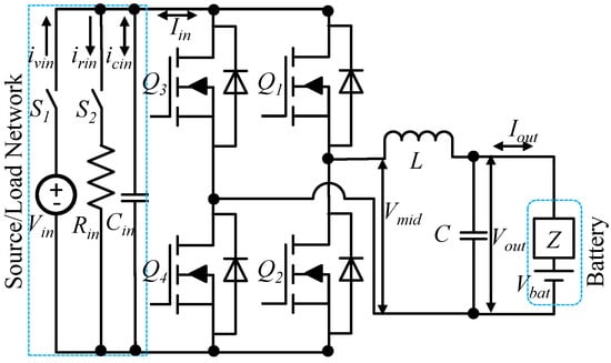 An AC current injector for batteries was implemented using buck, synchronous buck, boost, and resonant power converters [,,,,,,,]. A synchronous buck converter for AC current injection to battery was used in this paper as shown in Figure 3. In addition, a technique is proposed to use H-bridge topology to inject AC current as shown in Figure 4. , , and are SiC MOSFETs with anti-parallel diodes. An input network was used to deploy three modes of operation for the versatile control which consists of a DC voltage source , a resistor , and a capacitor . is input current which could have three parts , , and . and are used to control the network as source and/or load which determines online charging/discharging mode or offline mode of operation for AC current injection. The AC injection modes and corresponding possible switch states are in Table 1.