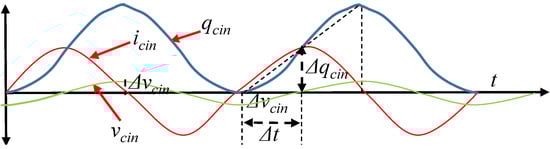 The input capacitor should be capable to store the charge and energy for half cycle of the injected AC current and discharge in rest of the half cycle. The value of is determined based on the allowable input ripple voltage and the magnitude, , and frequency, , of AC current. The charge storage, sinusoidal ripple current, and ripple voltage across input capacitor is depicted in Figure 5. is used to bypass most of the AC current. Therefore, AC current through and should be negligible. Input capacitor current, , can be represented by (4).