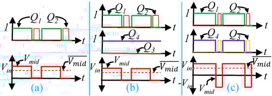 The PWM signals to drive the MOSFETs are shown in Figure 6. The gating signal and midpoint voltage for synchronous buck converter is in Figure 6a. and are complementary. Deadtime is considered between on states of and . The estimated average midpoint voltage is expressed by (16).