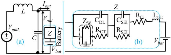 A Li-Ion battery has a small AC voltage ripple for large AC current ripple due to small internal impedance. The adaptive Randle equivalent circuit model (AR-ECM) of a Li-Ion battery can explain the internal impedance. AR-ECM is shown in Figure 7b. It consists of an open circuit voltage source, , battery inductance, , Ohmic resistance, , charge transfer resistance, , double layer capacitance, , Warburg impedance, , solid electrolytic interface resistance, , and capacitance, . The overall internal battery impedance in frequency domain, is expressed by (29) [].