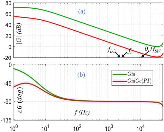 The bode plot of is shown in Figure 9 for the proposed system. The bode plot is based on selected parameters of Table 2 and from Figure 8. The resonance peak is not visible in bode plot due to small internal impedance. The internal parameters of a battery changes with state of charge and aging. Therefore, the nominal value of internal resistance can be used as an alternative to . At lower frequency, has a very high gain (≈70 dB). This means a very small duty perturbation causes a very high current perturbation which leads to instability i.e., 1% duty perturbation at 5 Hz would cause 31 A current perturbation whereas recommended current is only 20 A. This instability happens because of very low magnitude of internal impedance (40 dB). The instability is removed by designing a proper feedback and feedforward controller.