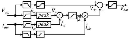 The value of is estimated using an estimator as shown in Figure 11. The estimator takes and as input. It uses low pass filters to estimate and . A high pass filter is used to estimate and . From the value of and , the magnitude of battery impedance is calculated. The saturation block is used to limit the unexpected values. Using , and , the value of is calculated by (53).