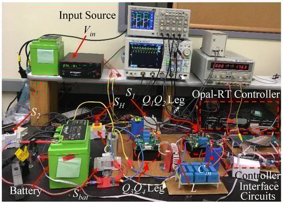 A re-configurable test bed was set up for both synchronous buck and H-bridge topologies as shown in Figure 12. The topologies are shown in Figure 3 and Figure 4. The switch, was used to configure the options between synchronous buck and H-bridge topologies. connected or disconnected the leg of H-bridge. The switches and were to connect and disconnect the input source, and input resistor, . The value of , , , L, and C were selected based on the discussion of III.A and Table 2. These MOSFETs were controlled by 100 kHz PWM signal generated by the Simulink based Opal-RT controller. The Opal-RT controller gets voltage and current as feedback through Op-Amp based offset clipping and scaling interface circuits. The proposed controller was implemented with a sample time of 20 S using Opal-RT (OP4510).