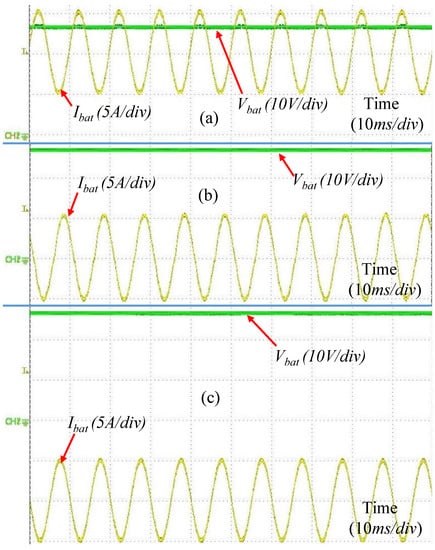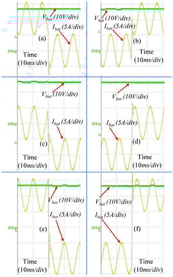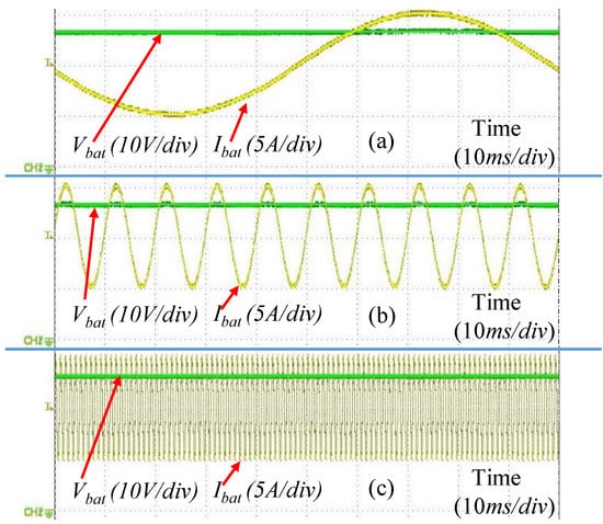 The AC part of the battery current was changed from 0 to 2 kHz for all three modes of operation using both synchronous buck and H-bridge converters. The battery voltage and current for 10 Hz, 100 Hz and 1 kHz for mode 1 using the synchronous buck converter is shown in Figure 15. The dynamic response for mode change using the proposed controller is shown in Figure 16. In these cases, both and were turned on. The proposed versatile controller was validated by successfully testing the additional conditions listed in Table 4.