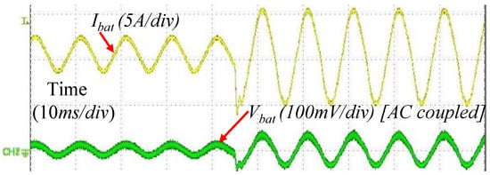 The steady state battery voltage and current for different modes of operation using the synchronous buck converter are shown in Figure 13. The DC current of the battery for different modes were +10 A, 0 A, and −10 A. The same operation was verified using the H-bridge converter also. The amplitude of the AC injection current was 5 A and the frequency was 100 Hz. The battery voltage was 13.5 V as DC average. The battery had a very small internal impedance (maximum 15 m). Therefore, small battery voltage ripple due to AC injection was not visible by DC coupling in an oscilloscope. The battery voltage ripple is shown in Figure 14 using AC coupling. In this case the battery was operated in mode 1 for 100 Hz. The AC current peak was changed from 2 A to 5 A to observe the transient response and the effect of AC current to battery voltage. The controller was successfully able to regulate the current.