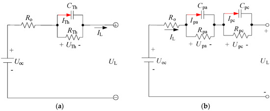 Figure 1a shows a first-order ECM (1RC) that consists of major components including open-circuit voltage (UOC), resistors (Ro, RTh) that are used to represent ohmic resistance and polarization resistance, respectively, and capacitance (CTh) that describes the battery’s transient response during charge and discharge [30]. The second-order ECM (2RC), as represented by Figure 1b, is defined as a dual polarization (DP) model, which can provide refined representation of polarization characteristics, concentration polarization, and electrochemical polarization independently [16]. The 2RC model includes the internal resistance component (Ro) and polarization resistances, Rpa and Rpc, that represent a resistance characterizing electrochemical polarization, and a resistance characterizing concentration polarization, respectively. The second-order ECM also includes effective capacitance, Cpa and Cpc, which represent the transient response of the battery’s charge/discharge process and the polarization characteristic, respectively. Factors including computational time, accuracy, and parameterization are key considerations of a BMS’s efficiency [32,33]. Adding RC networks up to a fifth-order RC model can increase accuracy, but RC networks beyond the second-order model would not achieve an effective balance between computational complexity and accuracy [17].