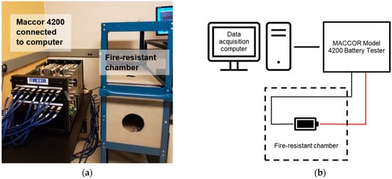 One cell was tested for each of the four chemistries. The four cells, including LFP, NMC, LMO, and NCA, are presented in Figure 2. The specifications of each cell are outlined in Table 5. Experimental testing for all four cells was conducted using a MACCOR Model 4200 battery testing system, with each cell inside a fire-resistant chamber at a room temperature of 23 °C, as shown in Figure 3. All the tests described below were run at a controlled ambient temperature to ensure consistency of the data.