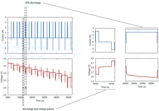 The characterization of each cell consisted of the following three stages: (1) capacity testing, (2) SOC–OCV testing, and (3) hybrid pulse power characterization (HPPC) testing. Capacity tests consisted of three complete charge/discharge cycles at 1C-rate. SOC–OCV tests consisted of a complete charge/discharge cycle at a C-rate of C/25. Lastly, HPPC tests were performed according to the test profile shown in Figure 4 (for the NCA cell as a representative for all four tested cells). At each SOC level from 0.1 to 0.9 with an interval of 0.1, a one-minute discharge/rest/charge pulse was run. The steps followed in the HPPC test were as follows, beginning at a fully charged state: