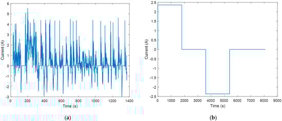 To validate the battery models, a dynamic profile and a non-dynamic profile were used, in order to represent different battery applications. A dynamic profile can be described as inconsistent charging and discharging cycles that mimic a real-life application. This is often used in battery testing to obtain real-life simulation data and can validate cell models. For example, UDDS represents general city driving conditions in the United States, established by the United States Environmental Protection Agency (EPA) [38]. The driving conditions can be translated into battery discharge and charge (regenerative braking) patterns. In contrast, a non-dynamic profile consistently performs battery cycles that simulate non-intensive electrical devices such as smartphones and other low usage devices. Figure 5 shows the current profiles for one UDDS drive cycle and a non-dynamic (ND) cycle. The four batteries went through these cycles under the MACCOR, and the experimental voltage and current measurements were collected. The experimental current data were used as the input for the battery models, and the predicted voltage was then calculated as the output using MATLAB. The cycles were run at 11 different initial battery SOC levels, ranging from 0.3 to 0.8 with an increment of 0.05, as this is the normal operating SOC range for many battery applications. The predicted voltage from the models was then compared to the experimental voltage to evaluate the performance of the models.