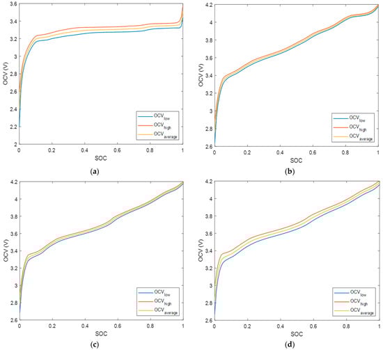 SOC–OCV curves for each lithium-ion battery chemistry tested: (a) LFP, (b) NMC, (c) LMO, and (d) NCA.