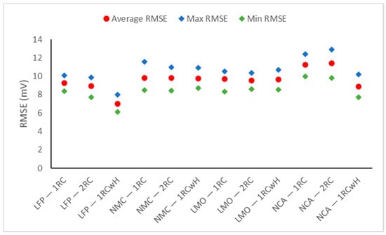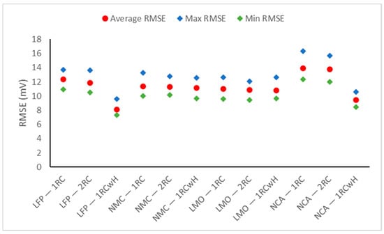 Figure 8 and Figure 9 show the comparison between the three models for the four chemistries in terms of RMSE. The ’Average RMSE’, ‘Max RMSE’, and ‘Min RMSE’ noted in the figures are the average, maximum, and minimum values of the RMSE for each of the 11 SOC levels that were tested for each model and cell chemistry.