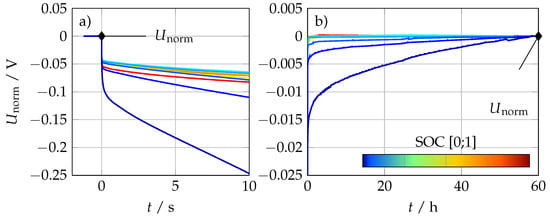Results of time-domain measurements for all SOC steps between 100% SOC and 0% SOC. (a) C discharge pulse for 10 . The voltage is normalized on the starting voltage for every SOC. (b) Relaxation period of . The voltage is normalized on the last data point of the relaxation period for every SOC. Note that the voltage was not totally relaxed after 60 for low SOC.