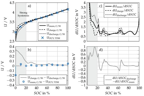 (a) Measured pseudo-OCV curve during discharging and subsequent charging with C/50 at 20 °C and the corresponding mean curve. Additionally, the relaxed voltage , which was measured right before the discharge pulse after three weeks of relaxation, are plotted. (b) Difference between the charge and discharge pseudo-OCV and difference between mean pseudo-OCV and (c) Differential voltage of the pseudo-OCV curves. (d) Difference between the differential voltage of the discharge and the mean pseudo-OCV curve.