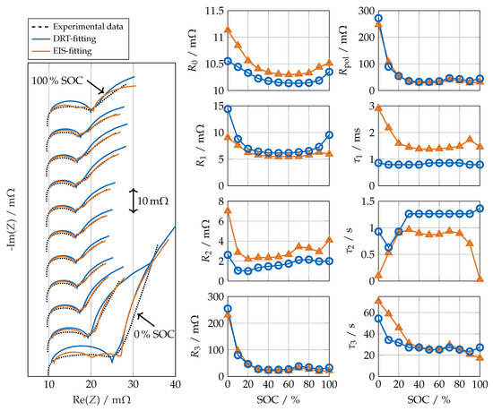 To validate the proposed parameterization procedure (DRT-fitting), it is compared to a reference EIS-fitting algorithm. Conventional EIS-fitting was performed using a multistart algorithm [34] with 100 starting points to fit three RC elements to the measured impedance spectra in the frequency-domain. To ensure comparability of the results, we also only used EIS measurements to calculate the DRT and perform the DRT-fitting. Figure 5 shows the resulting parameters for R and and the corresponding impedance spectra compared to the measured ones.