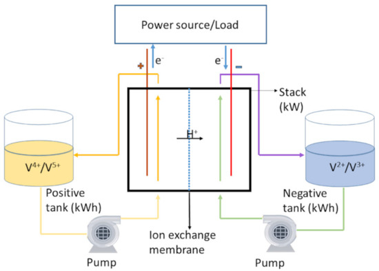 To store the chemical energy, the VRFB uses a mixture of vanadium compounds dissolved in sulfuric acid as the electrolyte. The V4+/V5+ (VO2+/VO2+) redox couple is utilized as the positive half-cell solution or catholyte and V2+/V3+ as the negative half-cell solution or anolyte with sulphuric acid as a supporting electrolyte [14]. The electrolyte is usually prepared by the electrochemical dissolution of vanadium pentoxide. The concentration of vanadium is held below 2 M due to the solubility limits of vanadium ions in sulphuric acid [11,15]. A VRFB comprising an electrochemical cell and two separate tanks to store the electrolytes is shown in Figure 1.