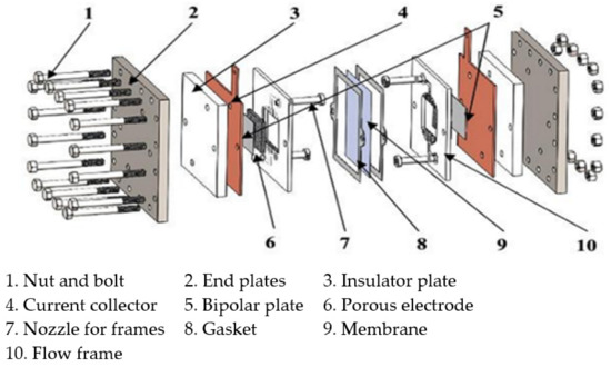 A single cell consists of porous, carbon felt electrodes, carbon (bipolar) plates, an ion exchange membrane, flow frames, gaskets, current collectors and endplates, as shown in Figure 2.