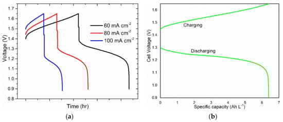 Different parameters can be derived from the cell cycling, one of the important ones being capacity utilization. The capacity utilization is the ratio of the actual charge capacity to the theoretical capacity depending on the amount of the electroactive species [39]. Figure 4a only shows a decrease in charging and discharging time with an increasing current density. An increasing current density will lead to a decrease in capacity utilization, since a higher current cannot be supported at the appropriate SOC limit [40] unless there is an accompanying increase in the flow-rate to overcome mass transport limitations at the high SOCs. Increasing current density results in the decrease in both voltage efficiency and capacity utilization. While both can be improved by increasing electrolyte flowrate, this could be at the expense of higher pumping energy losses. Therefore, it is very important to optimize the current density with acceptable, overall system efficiency to meet the economics of VRFBs [6,41,42,43,44,45].