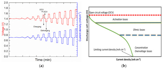 Polarization plots have proved an interpretive tool for recognizing the prevailing limitation in cell performance. The polarizations are obtained by plotting cell voltage against the current during charge or discharge at a fixed SOC. Normally, the polarization curve is determined using regulated current steps to record the voltage at each current step. The cell is initially charged at a specified current for a short time (sec to min) and the potential is recorded. Following a short rest at the OCV, the cell is then discharged at the same current and the discharge voltage is recorded. The process is repeated from the low current density to very high current density, preferably in a randomized order to minimize trends associated with changes in the SOC during the measurements. The measured cell voltage is plotted against the current density to obtain the polarization curves for the charging and discharging processes. This gives an overview of the different voltage losses in the cell, which comprises activation, ohmic and concentration polarization. Figure 5a,b depicts the polarization procedure and curve showing three distinct regions, namely activation, ohmic and concentration polarization. Another important feature is the limiting current density that will vary with the SOC and flowrate.