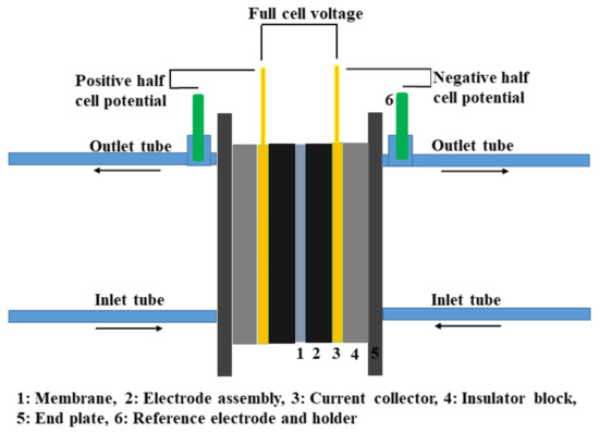 The same configuration can be used to optimize the flow rate, electrolyte composition and electrode type. Similarly, using the same type of configuration, Bhattarai et al. [77] made an attempt to identify the location of the power drop effect (PDE) in the VRFB cell by isolating the different components of the cell. Examining the full cell voltage and half-cell, the anion exchange membrane was found to be responsible for the observed PDE effect in the VRFB. The main drawback of this arrangement is the ohmic loss from the positioning of the reference electrode. Since the reference electrode is inserted into the outlet pipe, it suffers from ohmic loss. This can be mitigated by inserting the reference electrode directly in front of the porous electrode; however, the proper configuration to adjust the reference electrode is required.