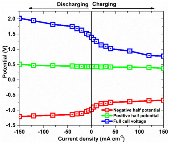 From the configuration, cell cycling, as well as polarization measurements, were performed using a battery tester and multi-channel potentiostat. The full cell voltage between the terminals was continuously recorded. Simultaneously, the half-cell potentials between each terminal and the reference electrode were constantly measured by the potentiostat. To estimate the iR loss due to the positioning of the reference electrode, three reference electrodes were placed at the outlet at various distances from the porous electrode and the difference in the potential with respect to the change in the reference electrode position at different current densities was measured. From the plot of cell voltage/half-cell potential against current density the change in the overpotential in each half of the cell can be easily acquired, as shown in Figure 7.
