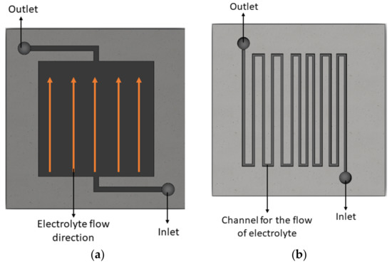 The typical VRFB configuration utilizes porous carbon or graphite felts as electrodes. There are two primary architectural designs for the distribution of flow: the conventional flow through type and the fuel cell flow by type. In flow channel architecture type, the electrolyte is distributed through a channel so that the dispersed electrolyte is parallel to the plane of the electrode. Flow channels provide pathways for the electrolyte to travel without necessarily having to pass through the electrode. In the flow frame type, the electrolyte is constrained to stream through the porous electrode without any free stream. Figure 8 shows the two types of architectural design for the flow distribution, which includes the serpentine type of fuel cell design and conventional flow frame, respectively.