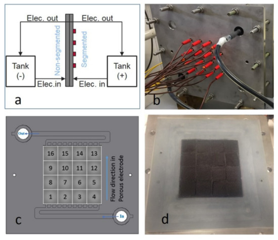 Experimental set up (a), positive segment side with 16 cables with electrolyte inlet and outlet (b), arrangement of the segments showing electrolyte flow direction (c) arrangement of cell with 16 segmented and insulating frame on the flow frame (d) (reproduced from ref [101], with permission from Elsevier).