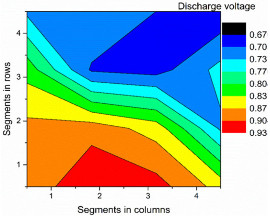 There are only a few studies with segmented cells in VRFBs. Hsieh et al. [99] studied two different cell types (A and B) with a 100 cm2 active area. The cell was divided into 25 segments and the local current or voltage of each segment was measured using a shunt resistor. In design A, only the current collector was segmented without graphite plate (bipolar plate) segmentation, while the connecting cables were directly inserted into the segmented graphite collector in their design B. The current density distribution at the beginning and the end of the charging and discharging process was acquired via these configurations. For type A design, non-uniform compression of electrodes, variability in contact resistance and use of a non-segmented thicker plate, showed the lateral flow of the current noticeably affected the current distribution. Similarly, design B resulted in low discharge capacity, voltage efficiency and poor distribution due to increased contact resistance.