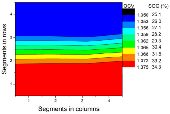 A very different approach of segmentation in terms of cell configuration and data analysis was performed by Bhattarai et al. [96]. A cell with an active area of 100 cm2 (10 cm × 10 cm) was divided into 16 identical segments. An exploded view of the whole configuration is shown in Figure 10. Segmentation was performed in the conventional flow design. The insulator plate was milled with the 16 cavities to accommodate the current collector and the bipolar plate. An effort was also made to segment the porous electrode. A non-conductive, highly porous and compressible frame made of polyurethane was employed to insulate each segment. Figure 11c shows the polyurethane plastic frame arrangement in the flow frame. The supporting endplates were also milled to insert the banana cables to the current collector. Figure 11a,b shows the schematic setup and image of the segmented side, respectively. A battery tester with integrated load and power supplies with 16 channels was employed to charge/discharge each segment.