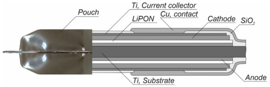 Currently, the most promising way to increase the specific capacity of SSLIB is to develop 3D batteries. The goal of 3D design is increasing the volumetric energy density of the batteries by enhancement of their specific surface area. Indeed, a planar solid-state design depicted in Figure 1 shows that relatively much of the space is occupied by inactive materials such as substrate, capsulation materials and packaging. The 3D design allows obtaining much higher energy storage with almost the same amount of packaging and substrate material. The internal surface area between electrodes and electrolyte in 3D batteries is higher, therefore a much higher total battery current can be obtained [9,10]. Market demand for smartphones and wearable devices including implantable medical devices, drug delivery systems, microsensors and so on opened a special niche for 3D batteries with typical size from 1 to 10 mm3 and power from 10 nW to 1 mW [1,2,3,4,5,6,7].