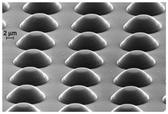 Then, one of the substrates (SSLIB-1) was used for functional layers deposition without additional treatment. The second (SSLIB-2) was subjected to SiO2 etching in a solution of HF:H2O 5:1 until complete removal of the oxide, and then re-oxidized under the same conditions. As a result, 3D structures in the form of rows of truncated cones with a base diameter of 10–12 µm, height about 3.5 µm and a period of 15 µm were obtained (Figure 2).