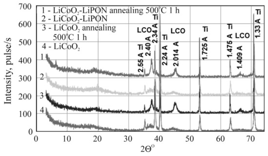 Since energy-dispersive microanalysis is insensitive to lithium, the layers of lithium cobaltite and LiPON were characterized by X-ray phase analysis. In this case, a double goal was pursued: (i) to show that the stoichiometric composition of lithium cobaltite (at least that of its crystalline phase LCO) is retained during magnetron deposition; and (ii) to make sure that the solid electrolyte is amorphous and remains so despite heating caused by subsequent layers deposition. For this, four test samples were made by depositing LiCoO2 and LiCoO2/LiPON on titanium foil. Two of them were annealed at a temperature of 500 °C in an argon. Diffraction patterns of all samples both annealed and without annealing are compared in Figure 3. No crystallized LiPON phase was found. Thus, annealing of LiPON films up to 500 °C in an inert medium does not cause their crystallization.