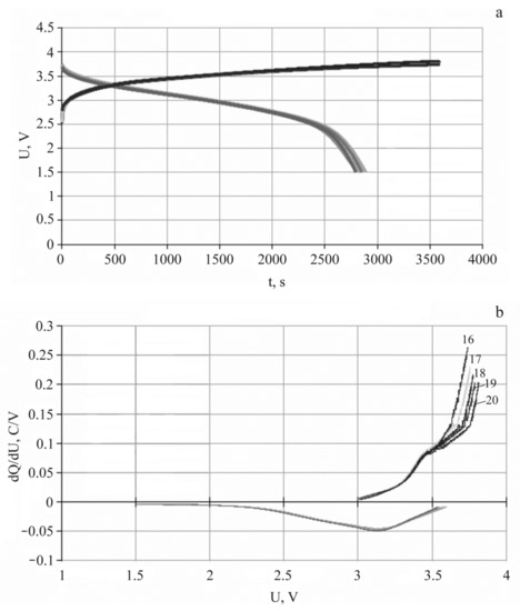 Charging–discharge characteristics of 3D SSLIB-2 (a) and its differential capacity (b) for 16th–20th cycles, current 15 μA.