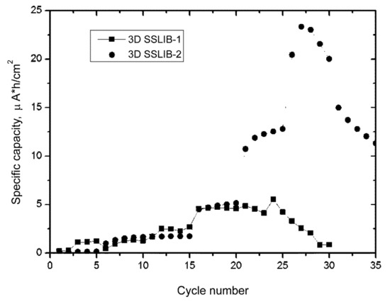 Thus, it can be assumed that in the 3D SSLIB-1 sample only “flat valleys”, situated between the rows of truncated cones, “work”. Moreover, the growth in capacity is limited by the area of these valleys. In the 3D SSLIB-2 sample with a smoothed profile of the Si substrate the entire area of the 3D structure contributes to its capacity. Expansion of the potential window to 3.6 V and the charge current to 35 μA, with a charge time of 1 h (cycles from 21st to 25th), leads to an increase in capacity to 12.5 μA·h/cm2. This signifies that the charge was incomplete in the previous cycles.