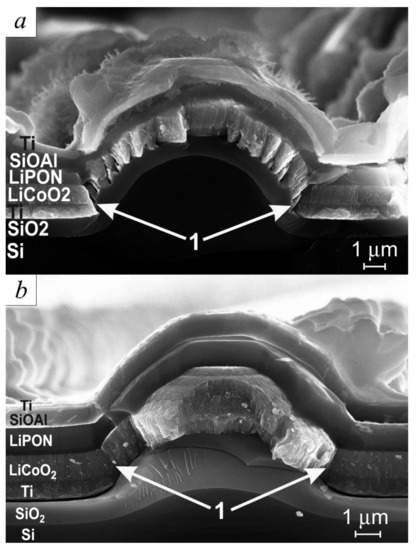 The change in the thickness of the functional layers can serve as a confirmation of the stated assumption about the “disconnection” of the cones at high current densities. Based on the well-known fact about a significant increase in the volume of silicon during its lithiation [20], it is possible to judge whether the lithiation–delithiation processes took place in the layer of the silicon composite Si-O-Al. SEM examination of 3D SSLIB samples proves that the processes of lithiation and delithiation of Si-O-Al layer proceeded unevenly over the area of the solid-state battery. Figure 7 shows the region where the processes of the Si-O-Al lithiation–delithiation exactly took place. In Figure 6b the thickness of the Si-O-Al layer on the cone surface after cycling remained unchanged—0.75 μm.