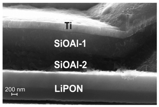 In the area of the 3D SSLIB-2 sample, shown in Figure 7, the increase in the thickness of the Si-O-Al layer makes 150–200% compared to the initial 0.75 μm. Another proof of the lithiation–delithiation is the change in Si-O-Al internal structure in the region of the film adjacent to the solid electrolyte LiPON (Figure 8). After 3D SSLIB-2 cycling, a part of the Si-O-Al layer has divided into two structural areas: Si-O-Al-1 and Si-O-Al-2. Both layers differ in structure from the original Si-O-Al, unaffected by lithiation, but in the region of the Si-O-Al-2 layer structural changes are much greater. The Si-O-Al-2 layer has significantly more structural defects characteristic for the Si-O-Al composite, subjected to the lithiation–delithiation cycles. In addition, the layer of solid electrolyte LiPON (Figure 7 and Figure 8), judging by electronic contrast, has also subdivided into two parts. The LiPON layer located near the Si-O-Al border is lighter than the LiPON layer near the LiCoO2 border.