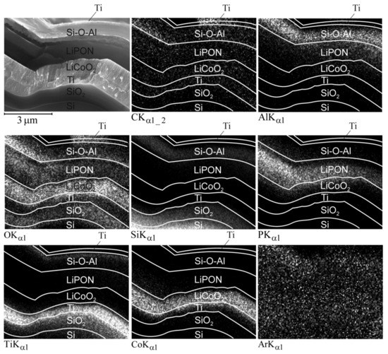 To explain the reasons for the change in the Z-contrast of LiPON and Si-O-Al particular regions after cycling, the SSLIB-2 cleavage mapping was performed. Figure 9 shows the SEM image of the mapping area and the maps themselves. According to the Ti map, the Si-O-Al-1 region contains a large amount of titanium. The O maps clearly show that there is rather more oxygen in Si-O-Al-2 than in Si-O-Al-1. The Al map shows aluminum diffusion into the upper LiPON layer, while the O map indicates that the oxygen concentration at the boundaries of the solid electrolyte is lower than in the central part. The P map reveals that during cycling, phosphorus leaves the upper edge of the solid electrolyte and partially penetrates into the positive electrode. Finally, it follows from the Ar map that, contrary to fears, argon does not form any cavities, but remains uniformly distributed over all functional layers.