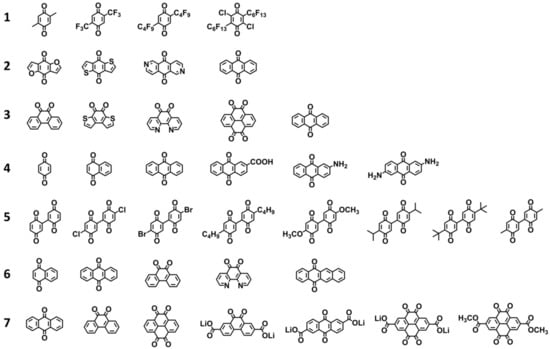 In order to examine the validity of the gas phase approximation, we collected experimental data of the lithiation redox potential of a wide variety of quinone-like electroactive compounds for Li-ion batteries [,,,,,,,,]. We separately performed LR analysis on the groups of molecules from different literature sources, thus ensuring consistency with respect to electrode synthesis, electrolyte formulation, cell configurations, charge/discharge rates, and other experimental conditions. While numerous experimental studies have been reported on quinone-like electrodes, we identified seven experimental datasets [,,,,,,], as shown in Table 1, that satisfied the following five criteria: (1) the total number of different compounds that have been tested should be at least three, which is essentially the minimal number of points for a LR model; (2) the redox potentials of the different molecules should span a range that is wider than 0.1 V vs. Li/Li+, as this value is similar to errors in DFT calculations []; (3) the redox potentials of compounds that involve a two-electron lithiation process should be clearly specified rather than be presented as a range of values []; (4) the lithiation sites on the molecules should be limited to the carbonyl groups that are directly attached to the rings of quinones, as opposed to the chemical functional groups of the molecules; and (5) molecules with more than four rings should be ignored because it is known that the π-π stacking interaction between quinones rapidly increases with the number of aromatic rings [] and the intermolecular interactions consequently increase, which is likely to result in errors within the gas phase approximation []. In addition to these criteria, fluorinated 2, 2′-bis-p-benzoquinone (F2-BBQ) [] from dataset No. 5 was removed because of its fast decomposition (12% capacity retained after 20th cycle) and therefore lack of discharge voltage data. As a result, a total of 39 compounds divided into seven sets were identified for the validation of the descriptors and computational models. The two-dimensional (2D) structures of these compounds are shown in Figure 1.