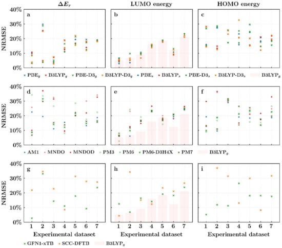 NRMSE of three descriptors—, LUMO energy, and HOMO energy—calculated with (a–c) DFT functionals, (d–f) SEQM methods, and (g–i) DFTB methods for the seven datasets. PBEg and PBEs represent the calculation of single point energy in the gas (g) and solvent phases (s), respectively. The shaded vertical bars in (b,e,h) show the fully B3LYPg calculated data.