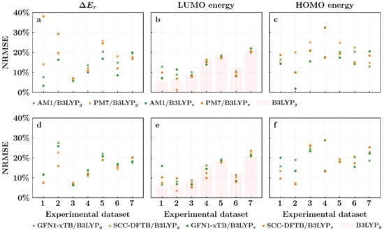 NRMSE of three descriptors: , LUMO energy, and HOMO energy. The hybrid schemes of SEQM/DFT (a–c) and DFTB/DFT (d–f) were used for the seven datasets. Accordingly, AM1/B3LYPg and AM1/B3LYPs suggest that the molecules were optimized only with AM1, and their energies were calculated by using B3LYP functional either without or with solvation effect, respectively. The shaded vertical bars in (b,e) show the fully B3LYPg calculated data.